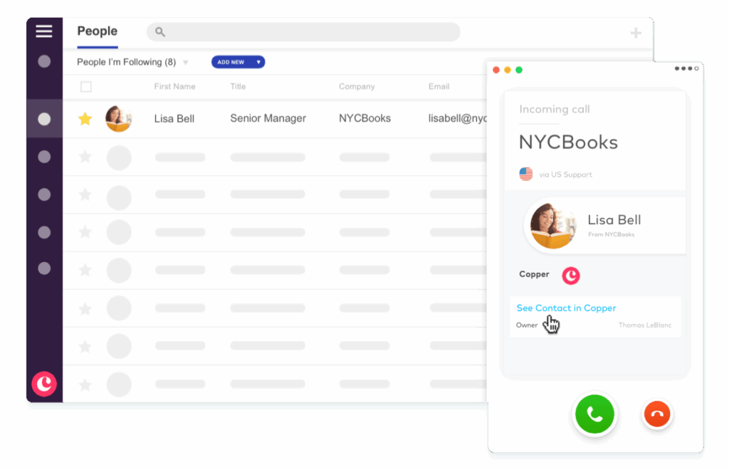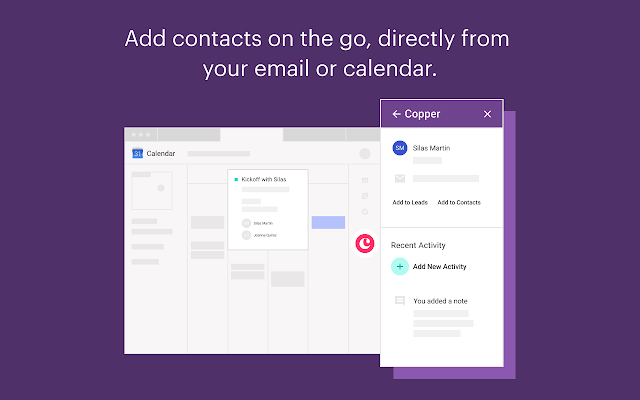 Auto-enrich Profiles – Copper scrapes the internet for contact and company information, social profiles, and automatically adds it to contact profiles.